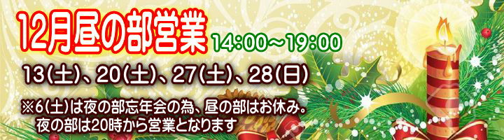 - 12月の昼の部、13(土)、20(土)、27(土)、28(日)営業